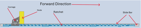 During operations, the ratchet’s design enables forward movement during deployment and disengages during its return stroke to allow reverse movement for loading. For loading, nodes are placed into the handling unit manually or e.g. via a manipulator arm. A ratchet bar with teeth and grooves aligns with a selectively engageable carriage in the skid urging the nodes in one direction. When disengaged and moved rearward, the ratchet allows free movement for stacking. An external actuator propels the nodes into the storage part of the skid.